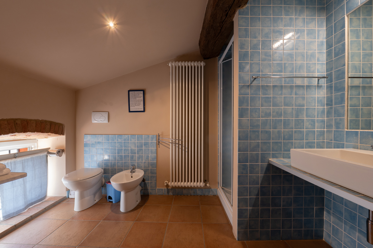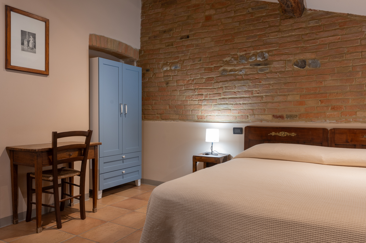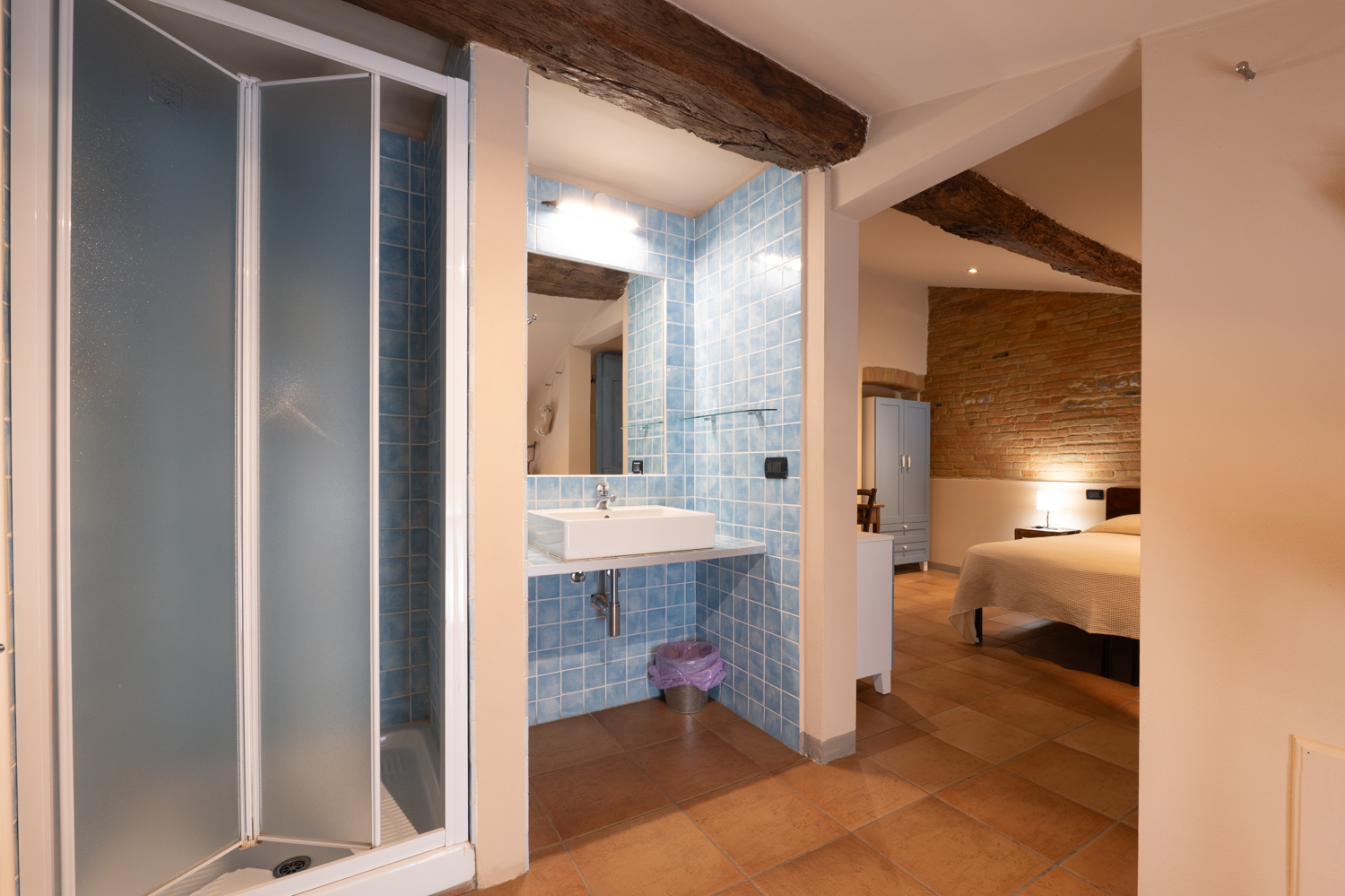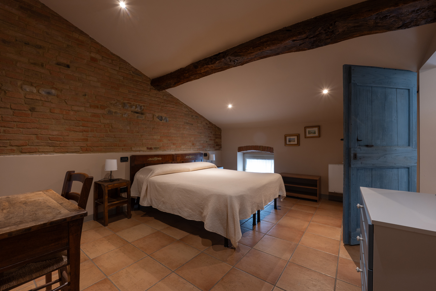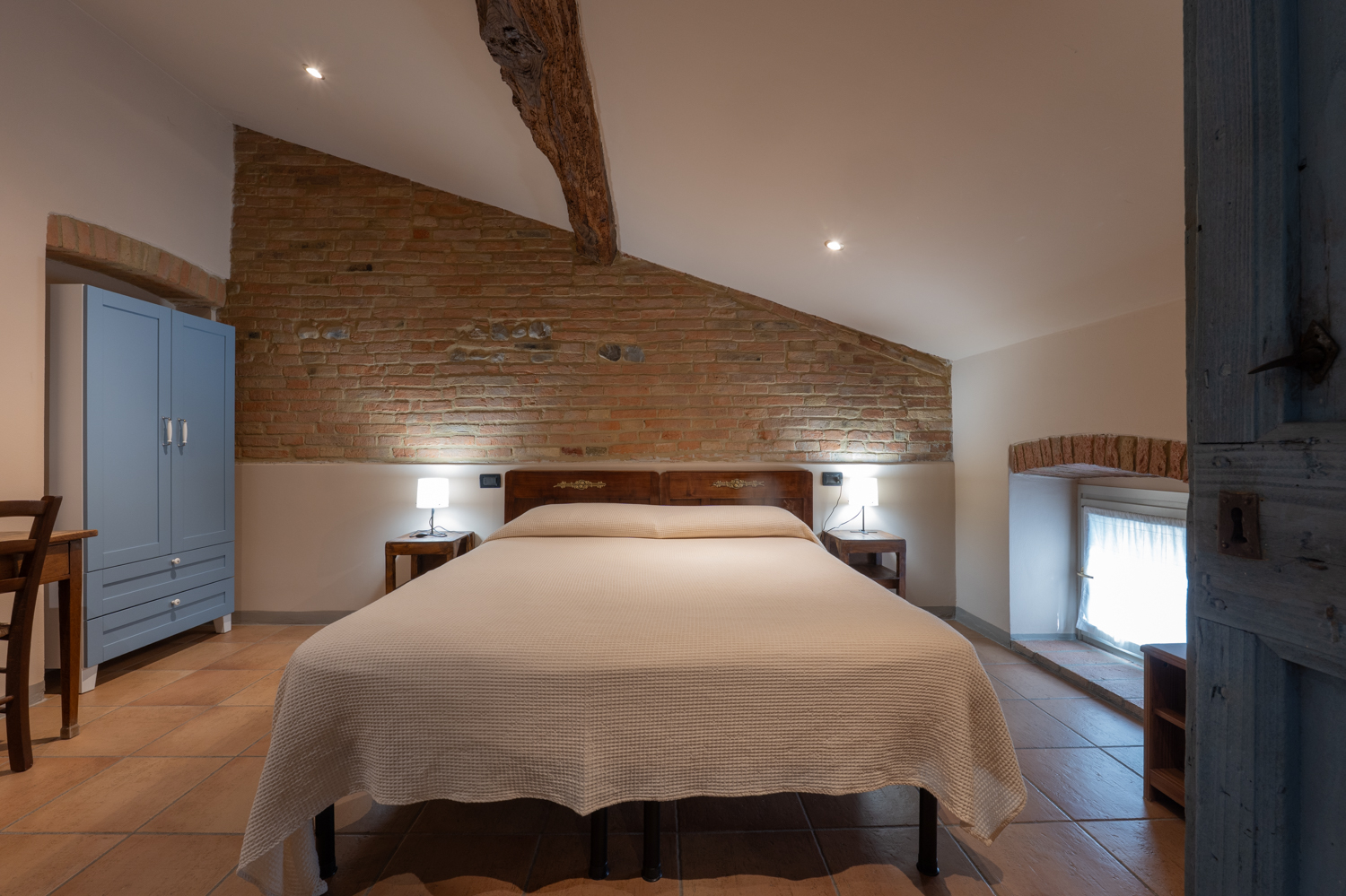 Camera doppia al secondo piano, con ascensore. Soffitto mansardato con antiche travi a vista, bagno con doccia, televisione, connessione internet, condizionatore.